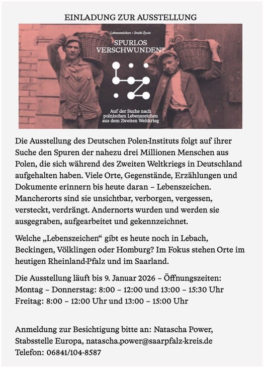 Die Ausstellung des Deutschen Polen-Instituts folgt auf ihrer Suche den Spuren der nahezu drei Millionen Menschen aus Polen, die sich während des Zweiten Weltkriegs in Deutschland aufgehalten haben … Welche „Lebenszeichen“ gibt es heute noch in Lebach, Beckingen, Völklingen oder Homburg? …